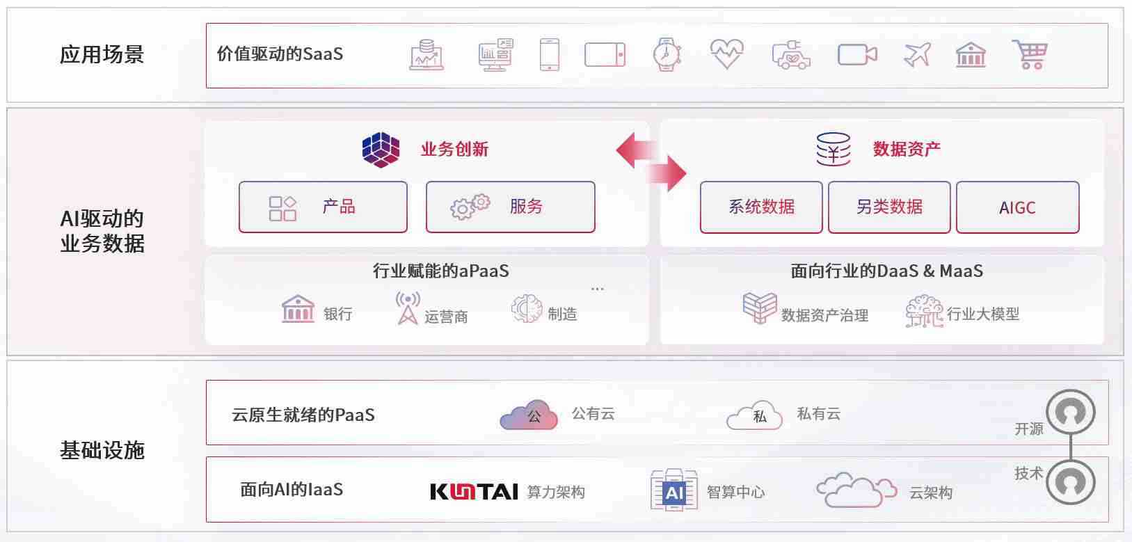 数字时代,,围绕企业数字化转型的关键要素,,,雷竞技数码开创性的提出数云融合战略和技术体系框架,,着力在云原生、、数字原生、、、、AI原生和信创产业上架构产品和服务能力,,,,为处在不同数字化转型阶段的快消零售、、、、汽车、、、、金融、、、、医疗、、政企、、、、教育、、、运营商等行业客户提供泛在的敏捷IT能力和融合的数据驱动能力,,,构建跨界融合创新的数字业务场景和新业务模式,,,,助力企业级客户建立面向未来的核心能力和竞争优势,,,全面推动社会的数字化、、、智能化转型升级。。。。